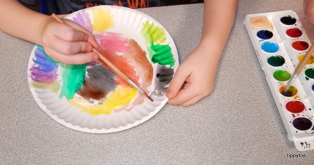 Décorez la seconde assiette avec de la gouache. La couleur placée aléatoirement donnera un très joli effet.
