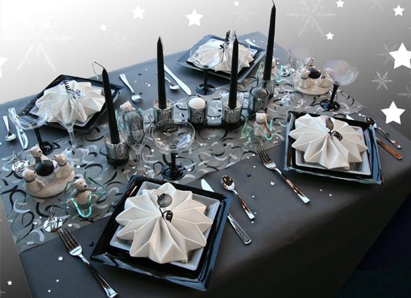 Quelques cierges sur un chemin de table élégant, des verres à vin plutôt classiques et des assiettes de couleur noire, voilà une table festive très charmante ! Installez quelques décorations de Noël faites par vos soins ou achetées dans le commerce, telles de petits bonshommes de neige, et le tour est joué ! Pour fignoler à la perfection votre déco de table, réalisez un pliage de serviette en étoile.