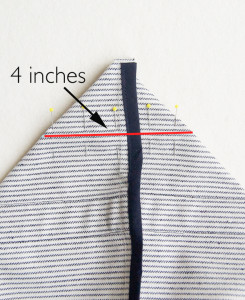 Former un léger pli pour faire une marque perpendiculaire aux coutures d’environ 10 cm (la ligne rouge sur la photo). Épingler le long de la marque.