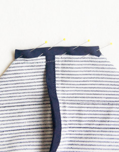 Envelopper les bords bruts de cette nouvelle couture avec un biais de 14 cm. Pour une finition soignée, placer les extrémités du biais sour lui-même. Épingler en place puis coudre avec du fil épais et bleu marine.