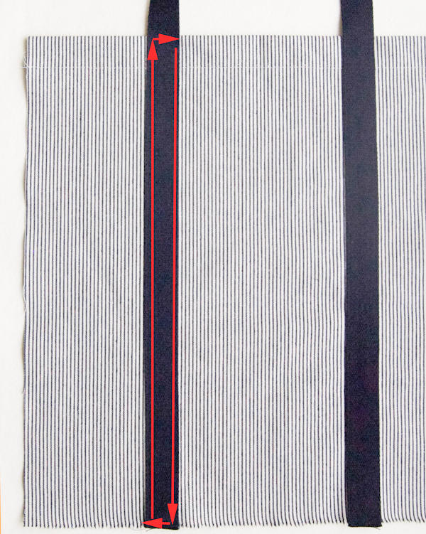 Arriver au sommet, mesurer 45 cm de sangle de poignée, puis direction inverse. Épinglez la sangle sur le côté droit du sac en vous assurant de ne pas torde la poignée. Il doit y avoir 11 cm de tissu sur le côté droit de la sangle et la couture de la poche doit être caché.